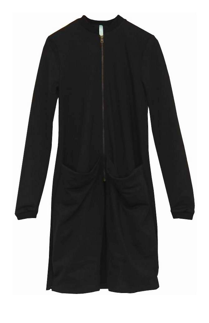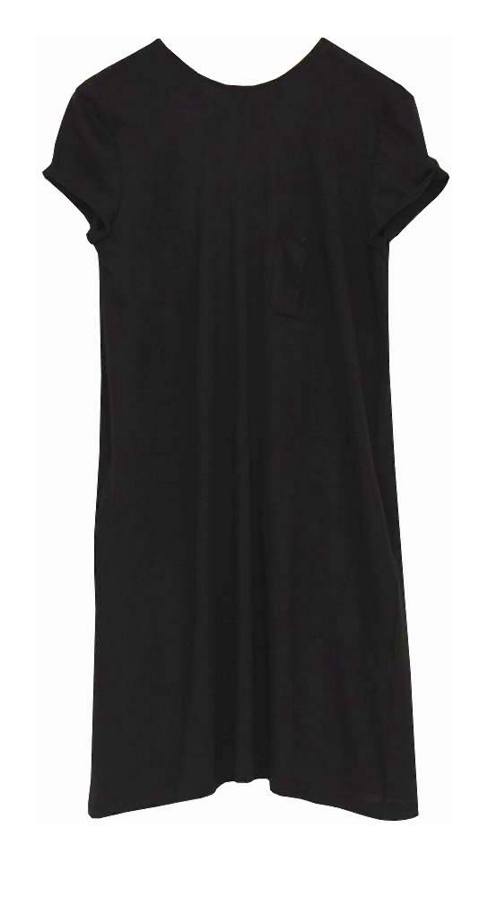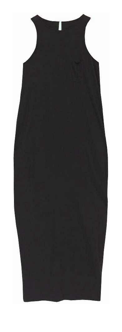 pierwszej. Czarna, prosta, z kieszeniami i dekoltem w kształcie litery V, podtrzymywanym przez miętowy pasek na karku.