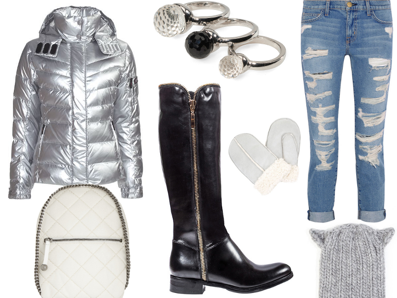Stylizacja 2: Srebrna pikowana kurtka Bogner Fire, kozaki zdobione złotymi zamkami Carinii, dżinsy Current&Elliot, pikowany plecak Stella McCartney, czapka z kocimi uszami Eugenia Kim, rękawiczki na kożuszku New Look, pierścionki New Yorker