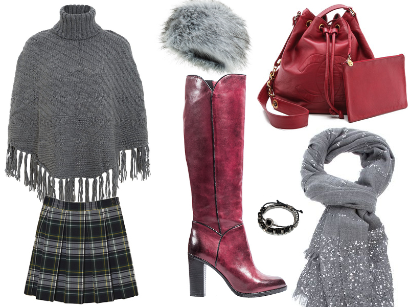 Stylizacja 7: dzianinowe poncho S. Oliver, karminowe kozaki na słupku Carinii, spódnica w kratę Merry Mart Uniforms, torebka -worek Chanel, futrzana czapka New Look, szal Valentino, bransoletka New Yorker