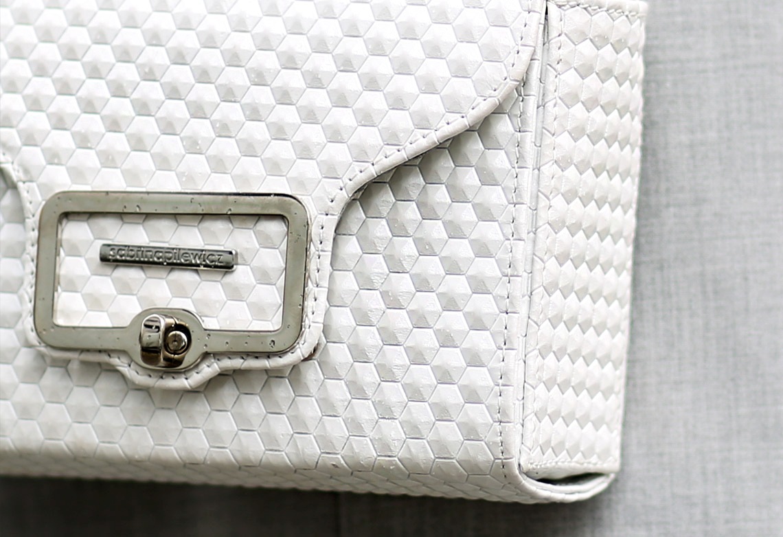 S.P. „Hexagon to nowa stampa w sześciokąty, to moja miłość od pierwszego wejrzenia. Pokochałam ją za jej unikatowy światłocień i wypukłą odrealnioną strukturę. Nowe tłoczenie zmienia absolutnie charakter torebki.”