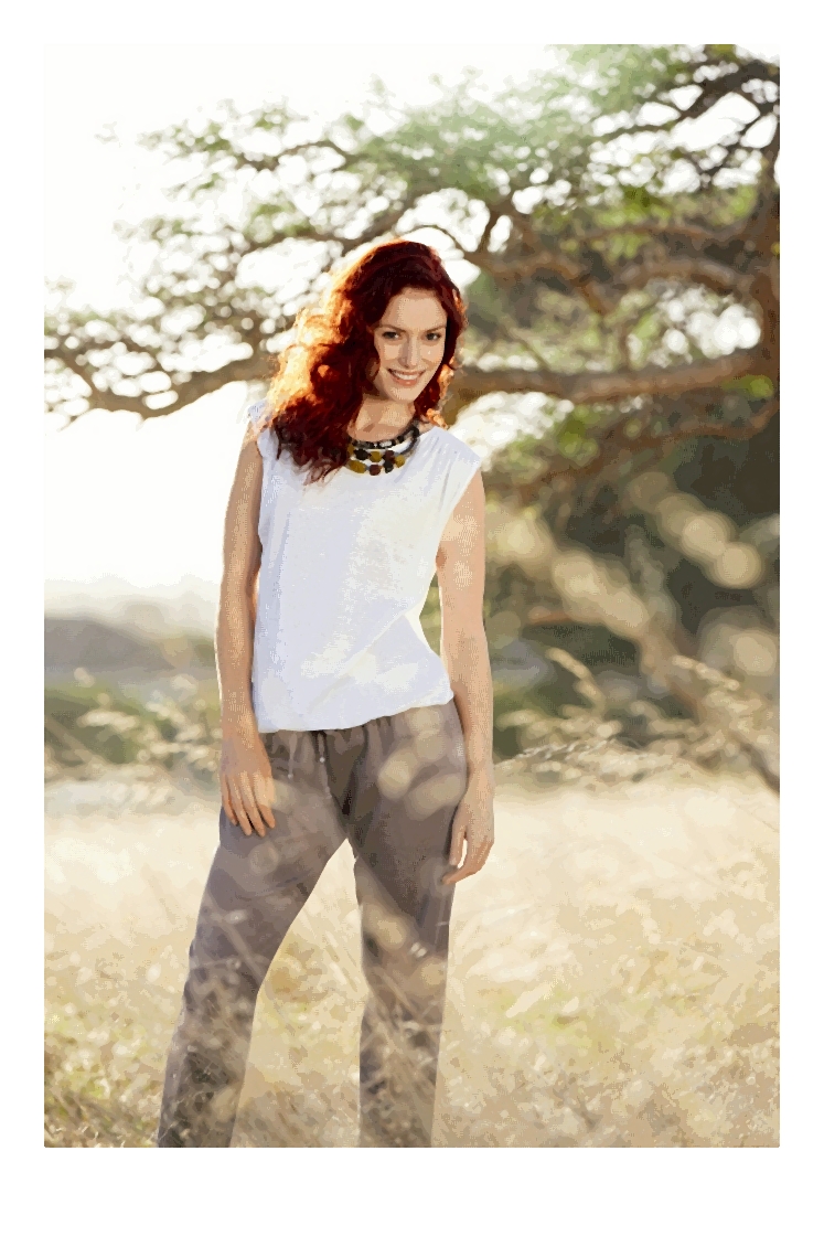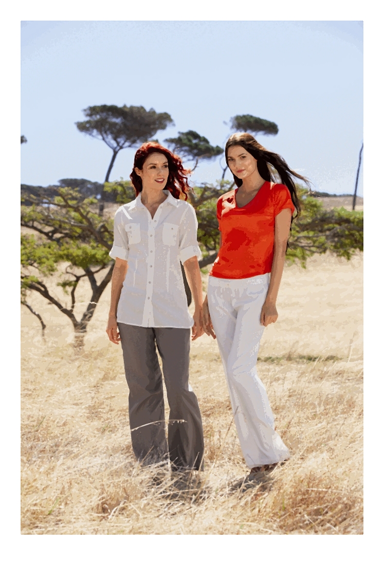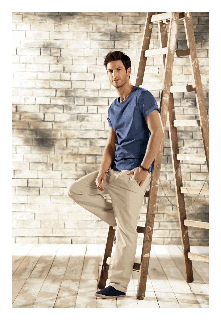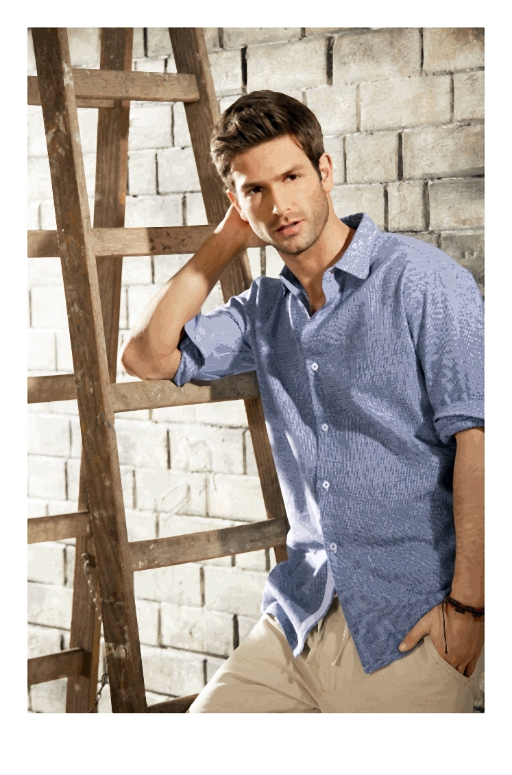 i sznurkiem do regulacji szerokości. Spodnie dostępne są w kolorze beżowym i granatowym, w rozmiarach 50-56. Do spodni świetnie pasuje koszula lniana z nowoczesnym kołnierzem cutaway. Dostępna jest w dwóch wzorach. Zarówno spodnie jak i koszule wykonane są w 55%z lnu i 45% z bawełny. Koszule do nabycia w rozmiarach M-XL.