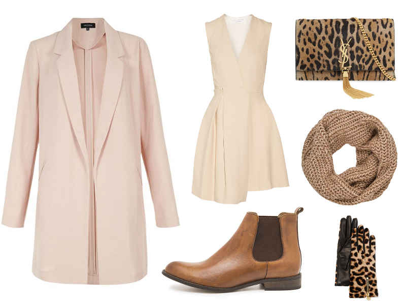 Zestaw 1: Płaszcz New Look, sztyblety Nessi, sukienka Victoria Beckham, torebka Saint Laurent, szalik komin Even&Odd, rękawiczki Diane von Furstenberg