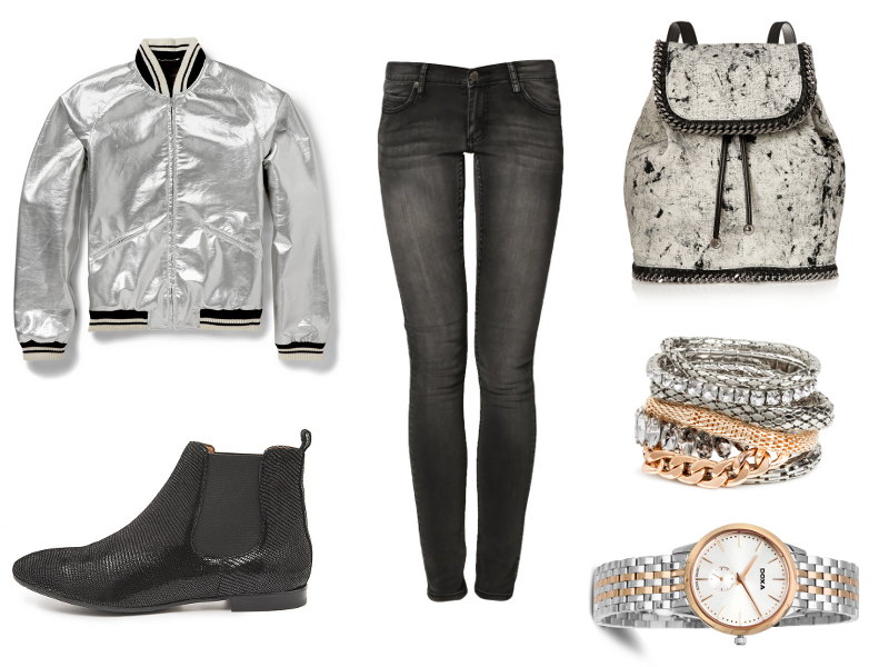 Na co dzień i mniej zobowiązujące okazje, proponujemy sportowy wygląd. Srebrny bomber jacket świetnie komponuje się z czarnymi dżinsami typu rurki. Elegancji temu sportowemu wyglądowi dodają czarne sztyblety z imitacji skórki pytona z elastyczną wstawką w cholewce, a rockowego charakteru – komplet bransoletek w kształcie węża w modnym złoto-srebrnym połączeniu.