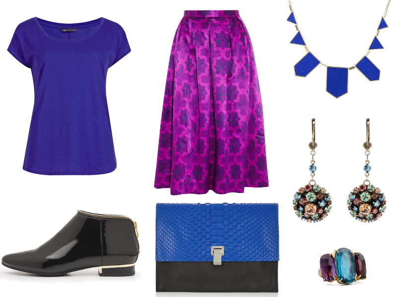 Zestaw 4: Spódnica House of Holland, sztyblety Nessi, tiszert Marks&Spencer, kopertówka Proenza Schouler, naszyjnik House of Harlow, kolczyki Konplott, pierścień Marco Bicego