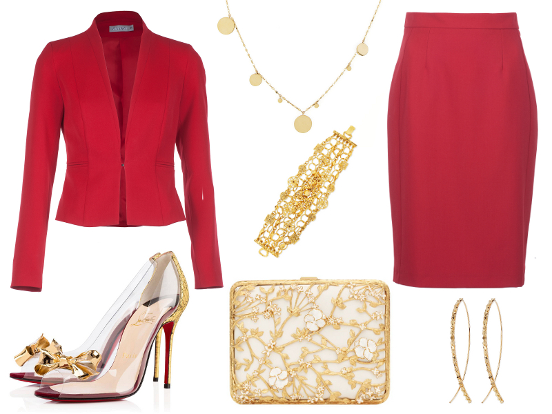 Ognista czerwień to jeden z najmodniejszych kolorów tej jesieni. Świetnie wyglądają w niej zarówno blondynki, jak i panie o ciemnym kolorze włosów i karnacji . Żakiet i spódnica w tym kolorze to wymarzony prezent dla kobiety, której praca wymaga eleganckiego stroju. Szkarłatny komplet idealnie sprawdzi się również na świątecznych wizytach rodzinnych i okazjach, które wymagają szykownego stroju. Wytworności dodadzą mu złote dodatki – ażurowa torebka i delikatna biżuteria.