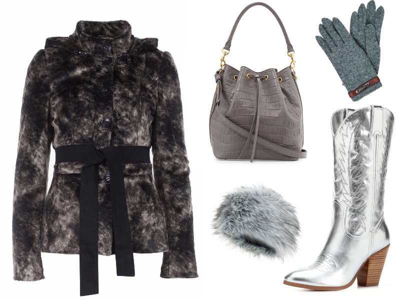 Fot. 1: Futrzana kurtka Vissavi, kowbojki Miranda Lambert, torba – worek Saint Laurent, czapka z futerkiem New Look, rękawiczki Ralph Lauren.