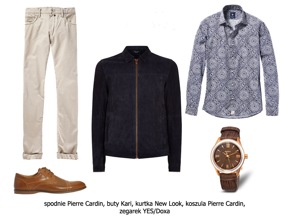 Kurtkę o pudełkowym fasonie mogą nosić też mężczyźni. Czarna, wykonana z zamszu uzupełni klasyczny zestaw i nada mu młodzieńczego luzu. Koszula w delikatnie niebieskie printy to hit sezonu – luźna i rozpięta będzie wyglądała nonszalancko. Elegancki kolor karmelu na butach i zegarku nadaje stylizacji charakteru vintage. Stylowy miejski zestaw sprawdzi się w wielu codziennych sytuacjach – na weekend, a także do pracy.
