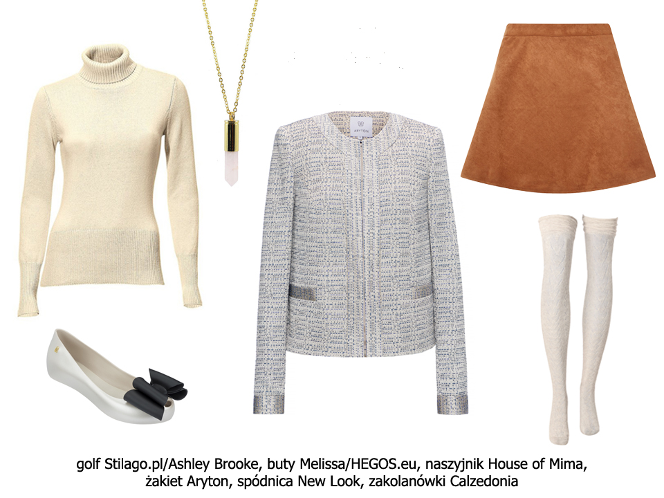 W połączeniu z innymi elementami typowymi dla londyńskiego stylu mod’s, jak trapezowa spódnica oraz ponadczasowy golf, stworzysz świeży i wiosenny zestaw. Wybierz modne w tym sezonie naturalne kolory – brązy i beże oraz tkaniny – lekkie dzianiny i zamsz. Cały zestaw nabierze nietypowego charakteru dzięki dodatkom takim, jak podkolanówki i płaskie balerinki w stylu vintage, a powiewu nowoczesności doda delikatny naszyjnik „pocisk”