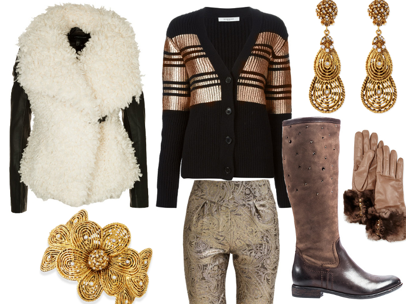 Stylizacja 1. Kurta z baranim kożuszkiem Tony Cohen, brązowe kozaki Carinii, złote spodnie Miss Selfridge, kardigan Givenchy, rękawiczki Valentino, biżuteria Jose&Maria Barrera.