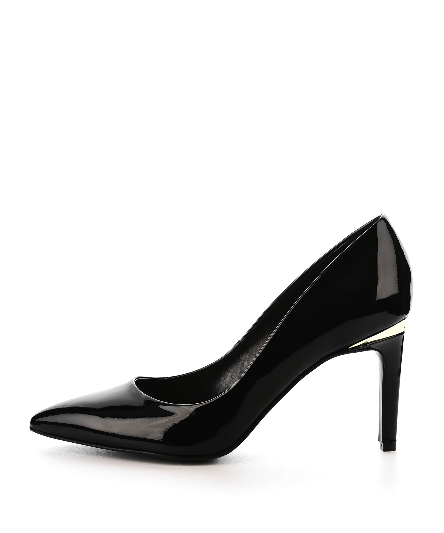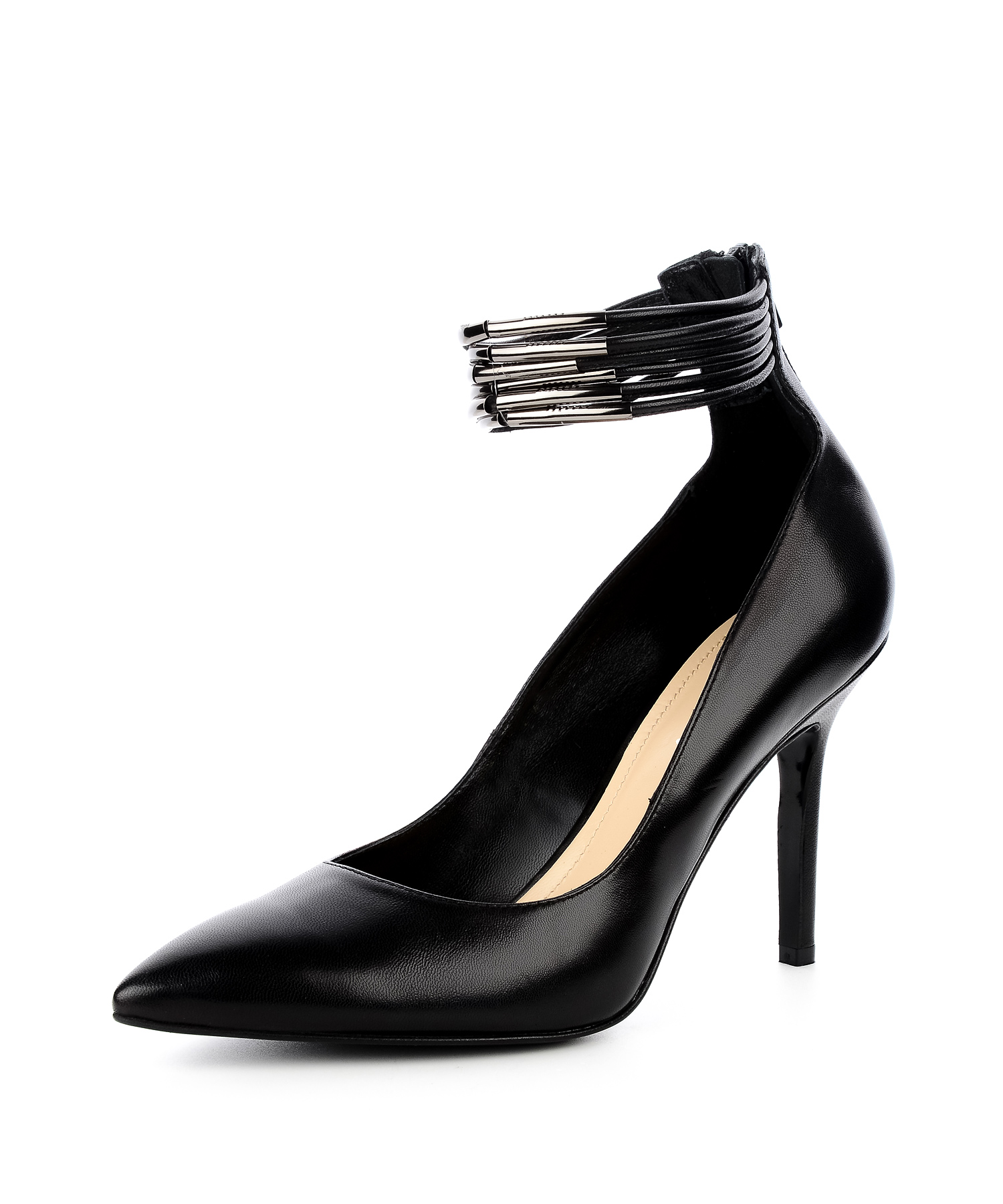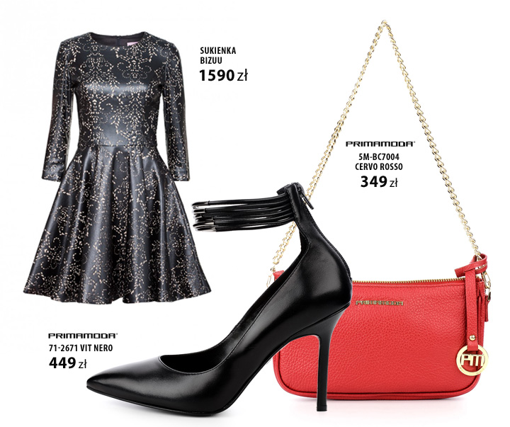 Czarne czółenka PRIMAMODA z zapięciem wokół kostki, idealnie dopełnią czarno-złotą rozkloszowaną sukienkę. Mała czerwona torebka w niebanalny sposób zaakcentuje całość.
