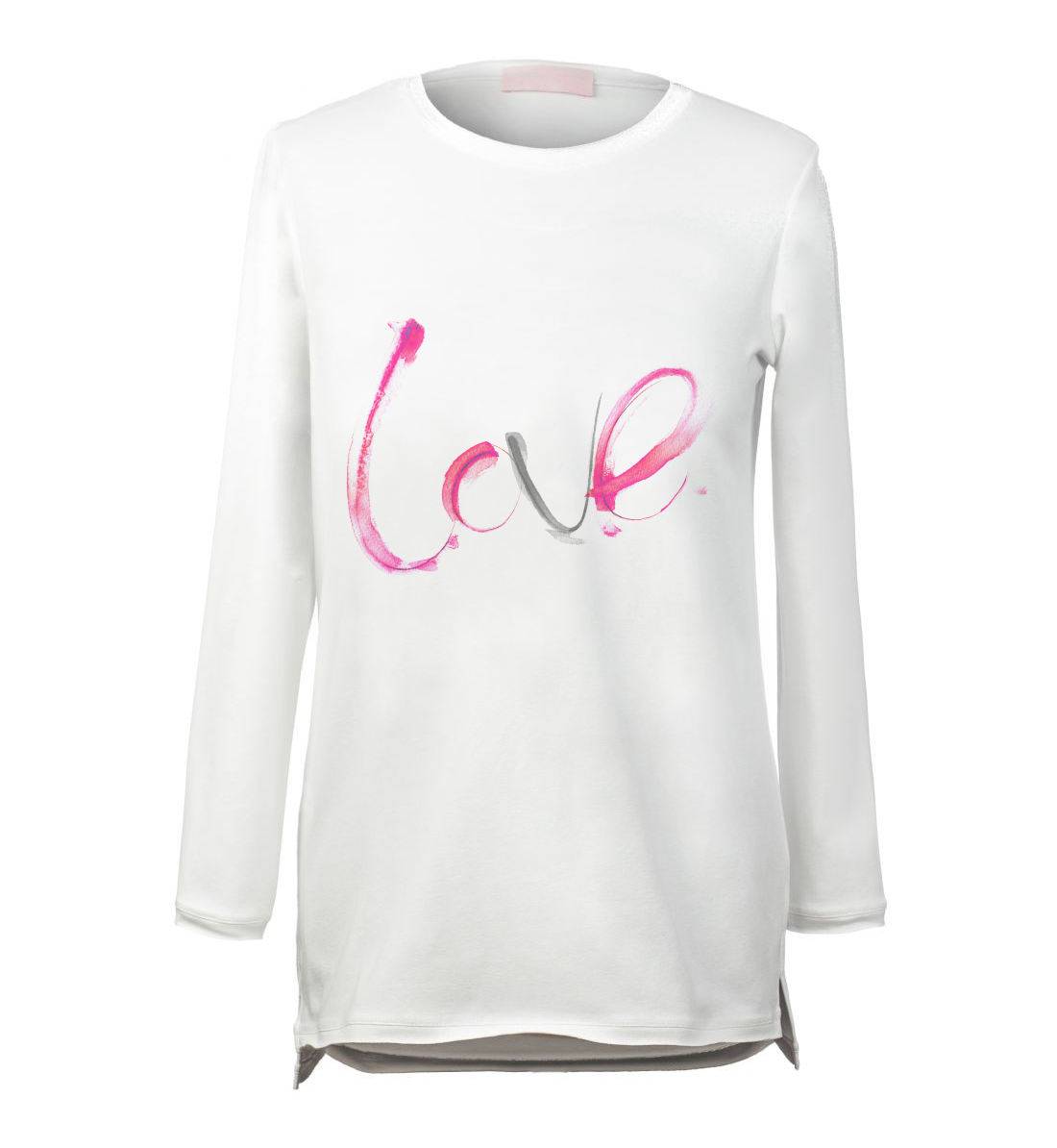 Walentynkowa bluzka projektantki jest dostępna w kolorze białym, z dużym napisem ‘love’ z przodu. Napis został namalowany akwarelą w różowo-szarej kolorystyce i przeniesiony na materiał. Koszulka posiada mały dekolt i długi rękaw.