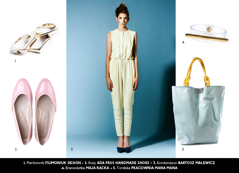 i prostotę. Klasyczny pastelowo żółty kombinezon sprawdzi się podczas imprezy czy kolacji. Uzupełniony prostą biżuterią nabierze wieczorowego charakteru, natomiast skórzane baleriny w kolorze pudrowego różu, dodadzą całości dziewczęcego uroku.