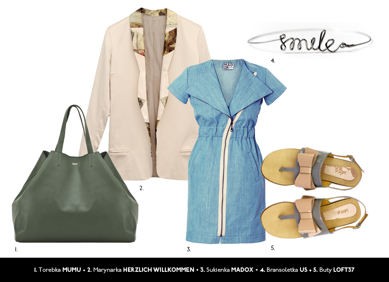 z tymi bardziej formalnymi. Taka mieszanka pozwoli na zachowanie wygody i miejskiej elegancji jednocześnie. Jeansowa sukienka z dużymi klapami, skórzane sandały i maxi torebka zapewnią całodzienny komfort, a dzięki beżowej marynarce z subtelnym nadrukiem outfit nabierze szykownej nuty.