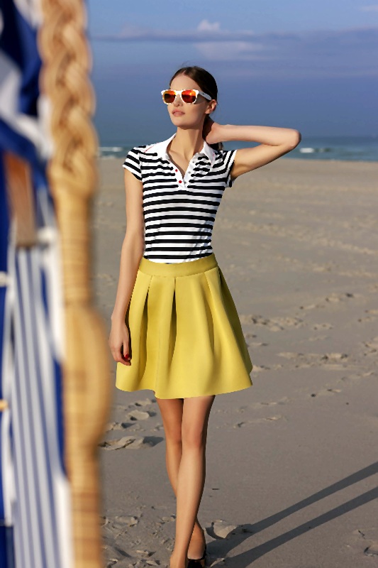 Dopasowana tunika w marynarskim stylu jest idealną propozycją na majówkę lub letnie podboje. Szerokie, czarne, poziome pasy optycznie modelują sylwetkę. Zestawiona z dżinsową kurtką i słomkowym kapeluszem nadaje się na weekendowy wypad ze znajomymi lub na kawę z przyjaciółką. Paski wkraczają także na koszulki w stylu polo.