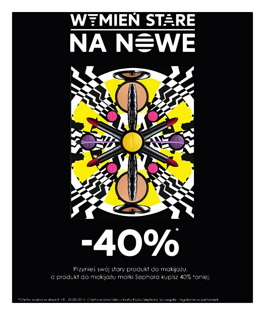 Warszawa, 17 marca 2014 r. – Masz ochotę coś zmienić? Uwielbiasz szminki, maskary i kredki? Jeśli tak, to akcja Sephora jest właśnie dla Ciebie! To proste – przynieś do perfumerii Sephora swój stary kosmetyk do makijażu dowolnej marki, a ekwiwalent od marki Sephora kupisz 40% taniej. Zrób wiosenne porządki i wypełnij kosmetyczkę najgorętszymi kolorami sezonu!